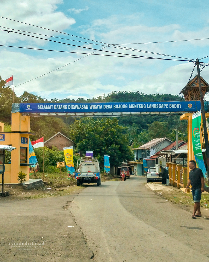 Pukul 9.12, kami tiba di Gerbang Desa Wisata Bojongmenteng, desa terakhir sebelum masuk Desa Kanekes. Tol Rangkasbitung rupanya benar-benar membantu memangkas waktu tempuh, tak sampai tiga jam kami sudah tiba. Kalau dari artikel dan blog yang saya baca, ada selisih 1 – 1,5 jam dengan rute sebelum ada tol.