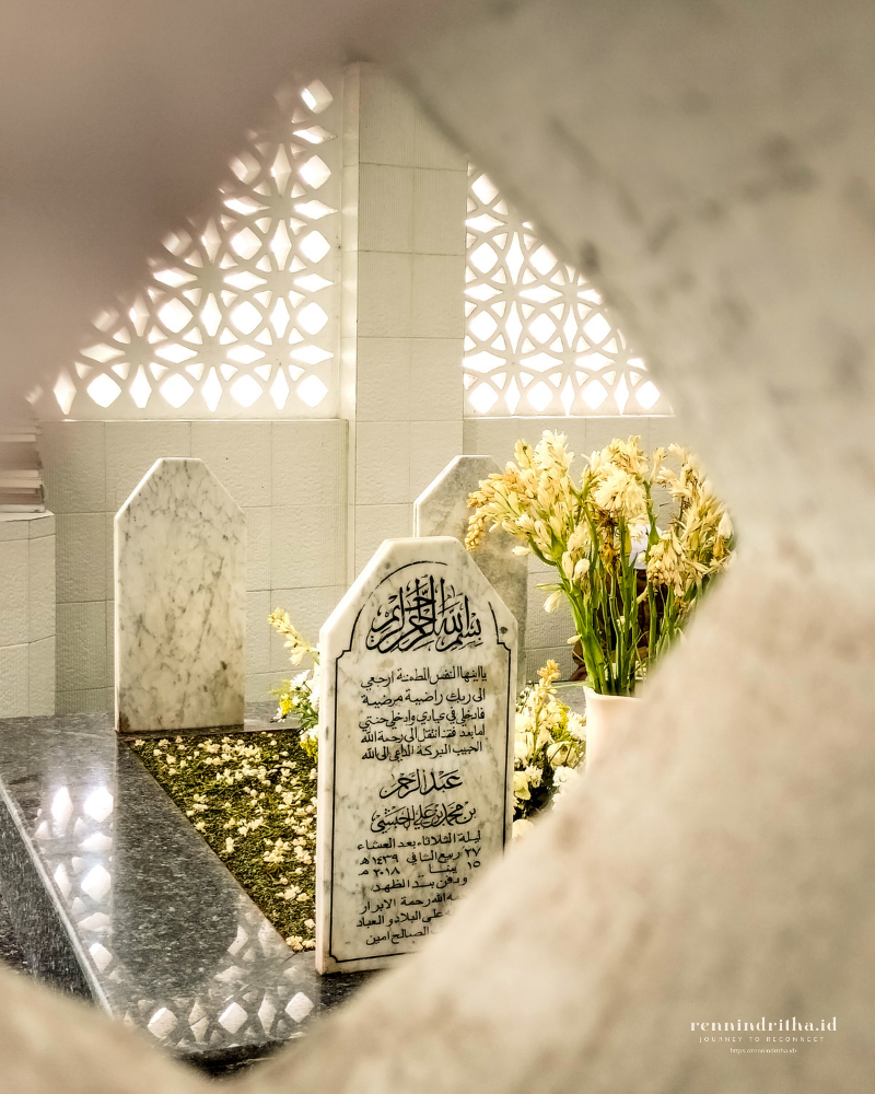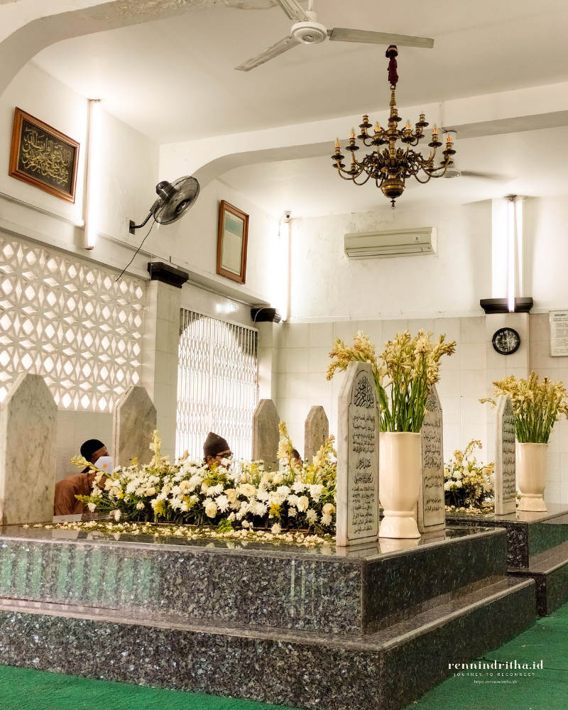 Masjid Al-Riyadh bukan sekadar tempat beribadah, namun juga kerap didatangi para peziarah. Wafat pada Oktober tahun 1968, Habib Ali Kwitang dimakamkan di sisi luar masjid. Ada tiga makam selain persemayaman Habib Ali, yaitu makam putra dari Habib Ali, Habib Muhammad bin Ali Al Habsyi (generasi kedua), dan istrinya Syarifah Ni’mah, serta Habib Abdurrahman bin Muhammad bin Ali Al Habsyi (generasi ketiga). Sekitar 30 menit saya berada di sana kemarin, tak putus rombongan peziarah yang datang, meski tidak dalam jumlah besar. Rombongan besar biasanya hadir di hari-hari tertentu.