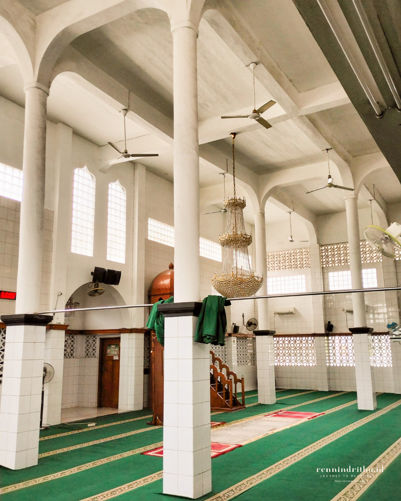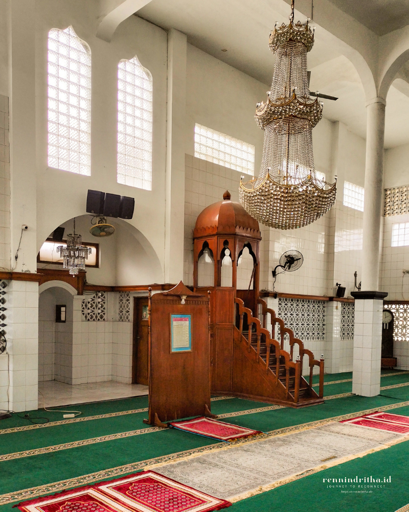 Selain lampu gantung ini, hal menarik lain adalah mimbar kayu berukir yang usianya juga sudah cukup tua. Kamu yang sering berkunjung ke masjid-masjid tua pasti sering melihat mimbar serupa ya.
