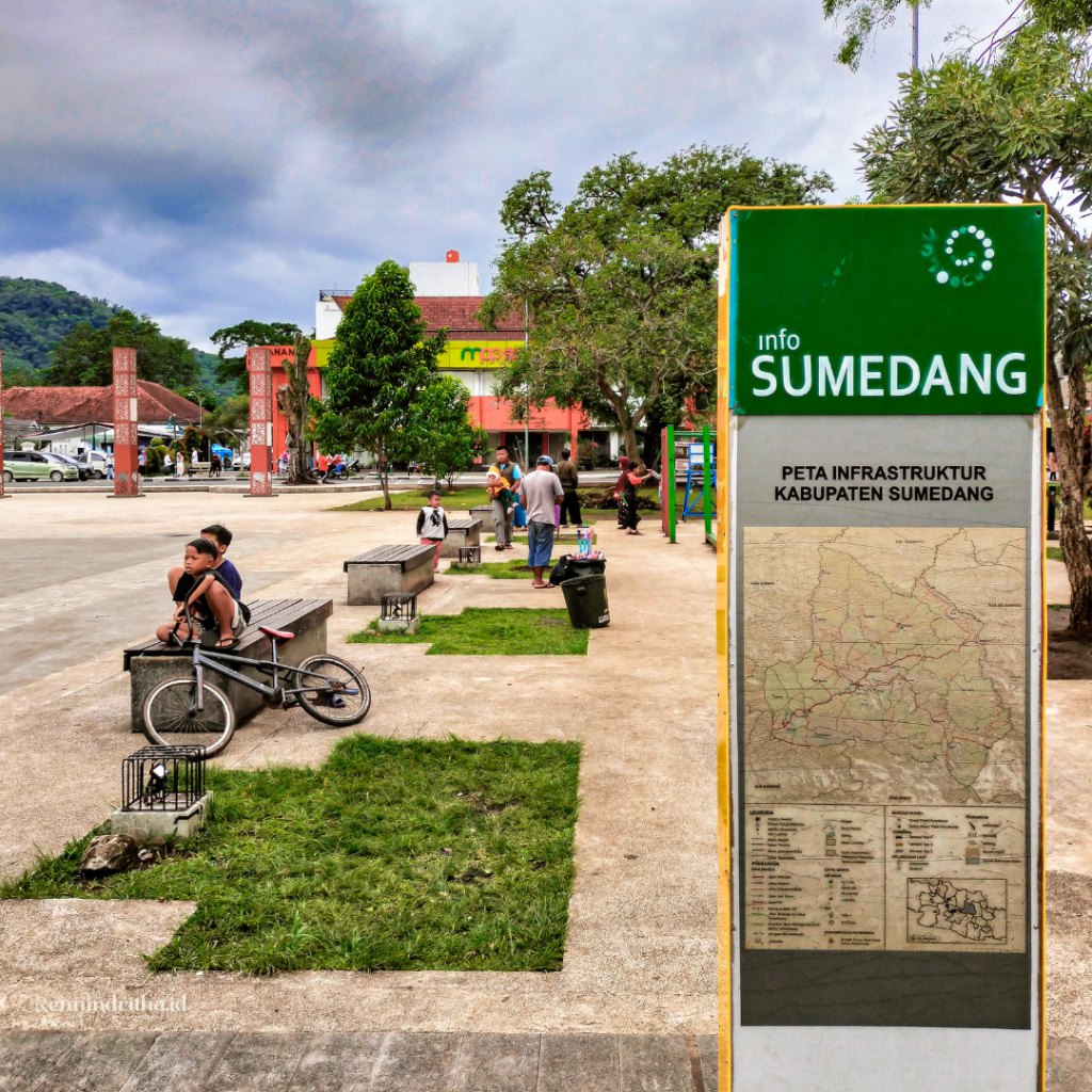 Agak kaget juga saya, terakhir lewat, sekitar empat tahun lalu, suasananya belum seperti sekarang. Tidak ingat detailnya, yang jelas pandangan rasanya tidak selapang sekarang. Rupanya alun-alun Sumedang termasuk satu dari 27 target revitalisasi alun-alun kota dan kabupaten di Jawa Barat, telah selesai direvitalisasi dan diresmikan Maret 2020 lalu dengan total biaya 16 miliar rupiah yang berasal dari APBD Provinsi Jawa Barat.