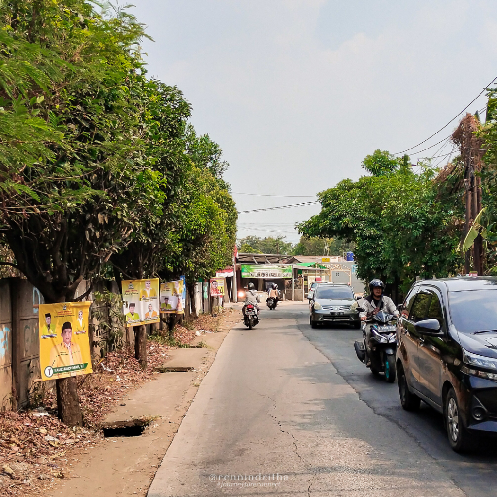 Dari rumah di Ujungaspal, saya menempuh jalur lurus ke selatan melalui Jalan Raya Kranggan, lalu Jalan Raya Cimatis dan lanjut ke Raya Leuwinanggung, sampai tiba di kolong tol Cimanggis, ikuti terus jalurnya hingga persimpangan besar di gerbang utama apartemen PGV. Ambil jalur lurus, jalan di samping gerbang, ikuti arahan googlemaps, hingga sampai ke Gang Tapos BG.