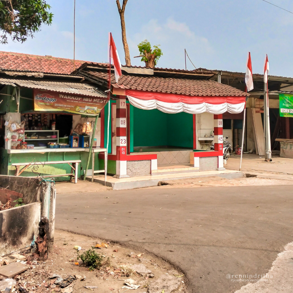 Dari ujung gang, kita masih harus menempuh jarak sekitar 500an meter di sebuah jalan yang pas untuk dilalui satu buah mobil, kalau terpaksa berpapasan agak sulit juga bagi yang tidak terbiasa lewat jalan ini untuk menepi. Jalan ini berakhir di sebuah area pemakaman wakaf warga yang cukup besar, tepat di atas tebing Kali Cikeas yang menjadi perbatasan wilayah Depok dan Bogor. Di seberang sungai tampak, gedung-gedung apartemen tinggi menjulang.