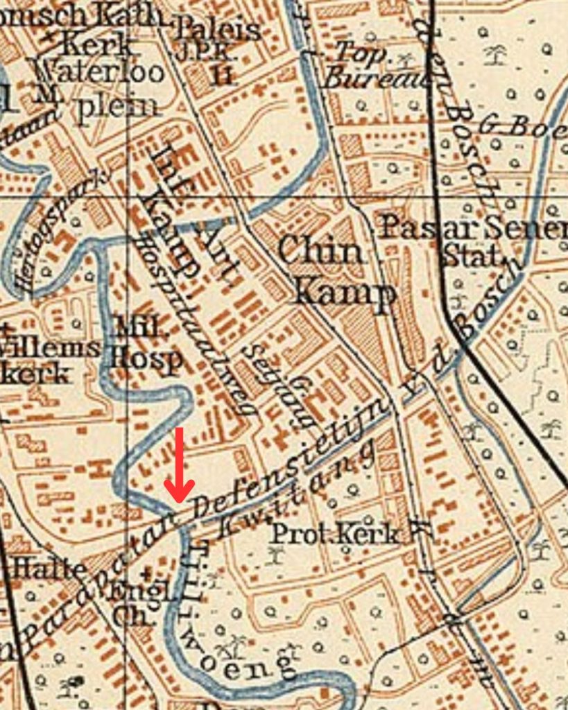 Selain tiang sutet tua, kisah lain dari masa lalu terpendam di tanah yang sedang kami pijak. Rupanya, median jalan di kawasan ini dulunya adalah sebagian dari Defensielijn Van Den Bosch, garis pertahanan berupa parit dan gundukan tanah yang dibuat semasa pemerintahan Gubernur Jenderal Van den Bosch (1830-1833) untuk melindungi kota Weltevreden. Sekarang sudah ditimbun, sepertinya berbarengan dengan dimulainya pemasangan jalur pipa distribusi air alias waterleiding dari Bogor ke Batavia.