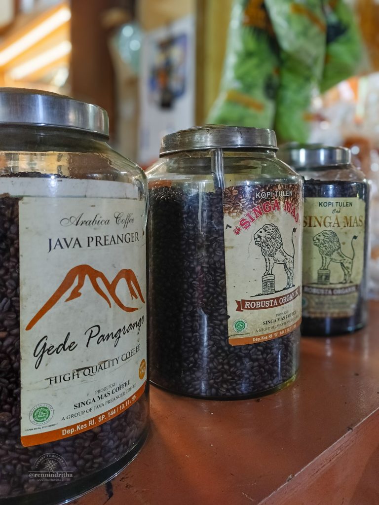 Saya hitung, tak lebih dari lima toples berlabel merk Singa Mas berukuran besar menampung biji kopi yang didominasi jenis robusta. Menurut penjualnya, rata-rata ini biji kopi asal Sumatra, jenis yang paling laku terjual di sana. Satu toples berlabel Gede Pangrango berisi kopi arabika asli dari kebun-kebun sekitar Cipanas dan Cianjur. Saya pilih sekilo kopi untuk dibawa pulang, robusta tentu saja.